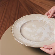 Delicate white patterns and a refined gold threading characterize the porcelain bread plate in the warm brown Castagna shade.