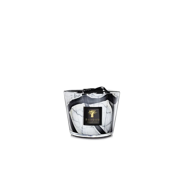 The scented candle is set in a hand-blown glass replicating grey marble with black strokes edged in beige. The elegance of the glass reveals the flame, giving an effect of a luminous stone.
